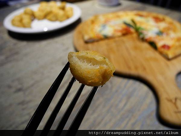 單純的麵粉下去炸的小點心,外面撒了起士粉帶點微鹹,很涮口。