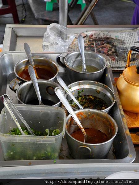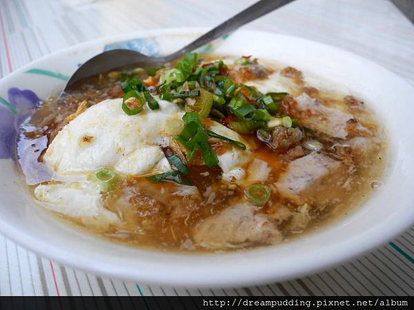 甚至用湯匙就能輕易的將它分解劃開!肉粿是用米做的,所以口感細緻,而這湯是虱目魚湯,裡面有小塊的魚肉塊跟細碎的豬絞肉,口感很豐富,加點辣更有層次感,是個很好吃的傳統小吃!