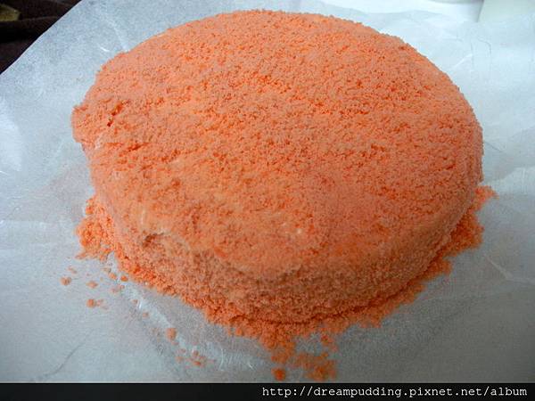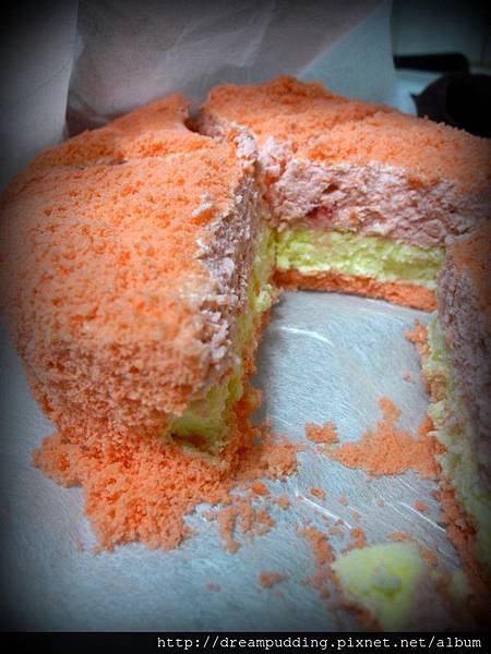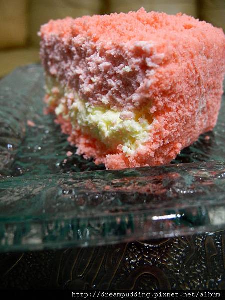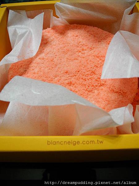 這個在拿取的時候要小心,雪精靈不惜成本的在蛋糕上灑滿了粉紅色草莓口味雪花,所以要連綿紙一塊拿取,不然雪花會灑落。