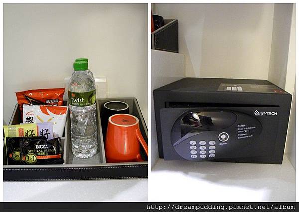 還有零食跟茶包、三合一咖啡能享用,以及兩罐礦泉水跟電熱水壺,也有小保險箱。