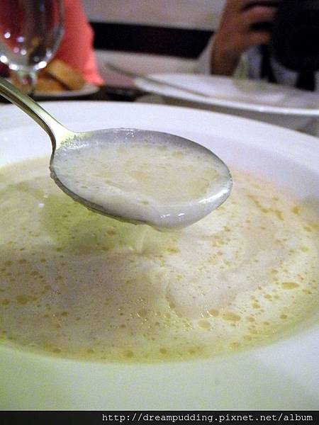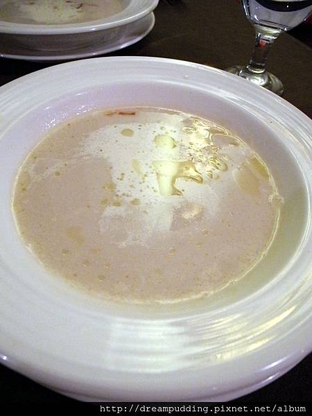 芋頭濃湯,口感很細柔,一開始我們以為是馬鈴薯,沒想到是加了米飯下去熬煮,所以口感才會如此細柔且順口,還有培根碎增加口感,滴了橄欖油增加潤澤度,是好喝的濃湯。