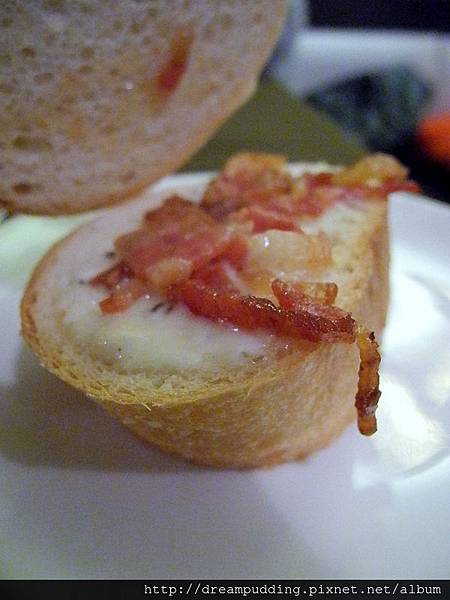 下層是培根奶醬,法國麵包烤的微酥,奶醬濃郁,帶點美乃滋的微甜,口感很不錯。