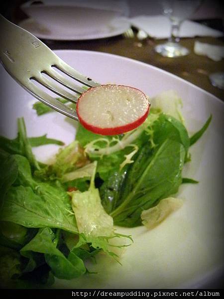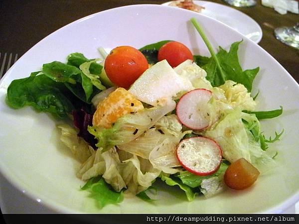 還放了價格較高的櫻桃蘿蔔,清脆的帶點甜,好吃。醬汁很特別的是芥末柴魚SAUCE,不嗆卻微微的提鮮,帶點柴魚鮮味的回甘,水果嚐起來更甜美,沒想到芥末、柴魚汁跟生菜還有水果會這麼搭。