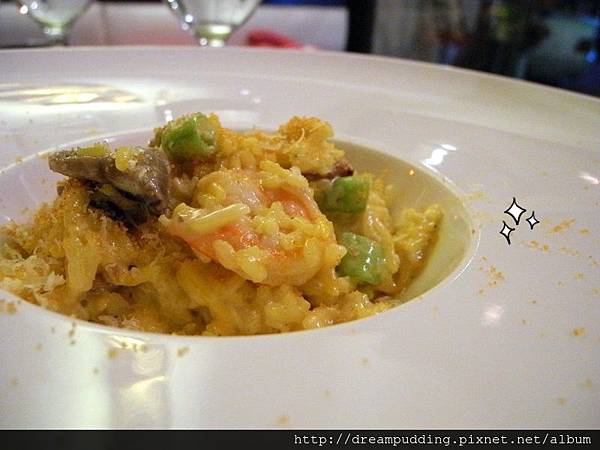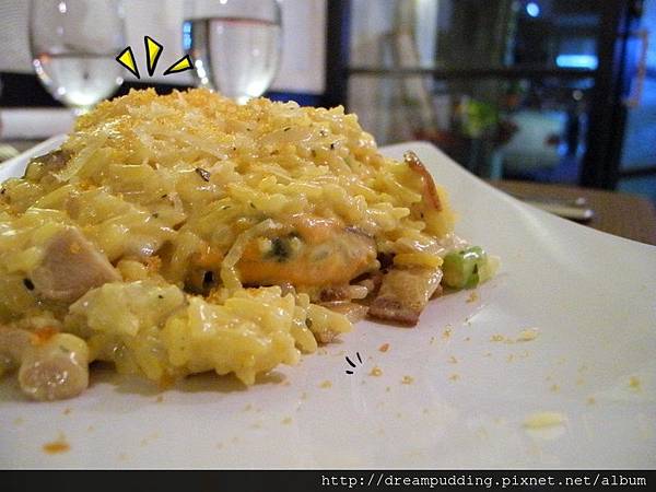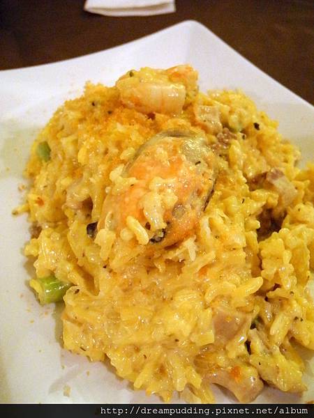 口感有很濃郁的奶味,後來問了主廚才知道原來主廚除了加鮮奶油還加了BLUE CHEESE(藍乳酪),BLUE CHEESE是乾酪的一種,特點是以青黴菌發酵而成,味道會較一般起士濃郁許多。所以燉飯有濃厚的奶味,海鮮的鮮美感比較不明顯,喜歡奶醬的人會很愛。
