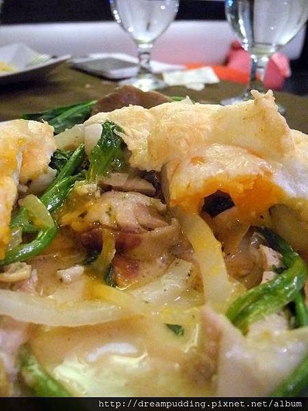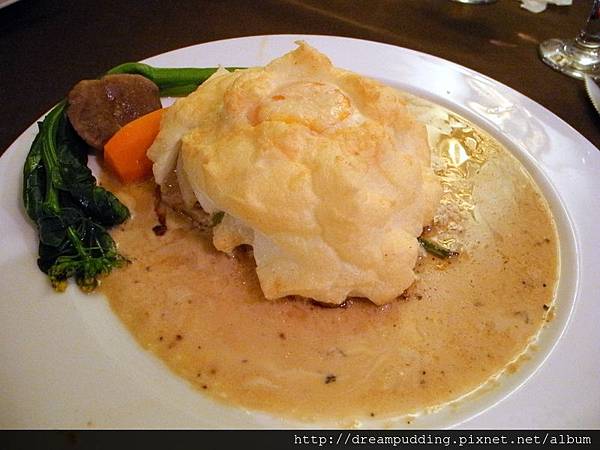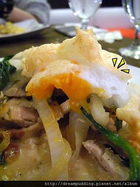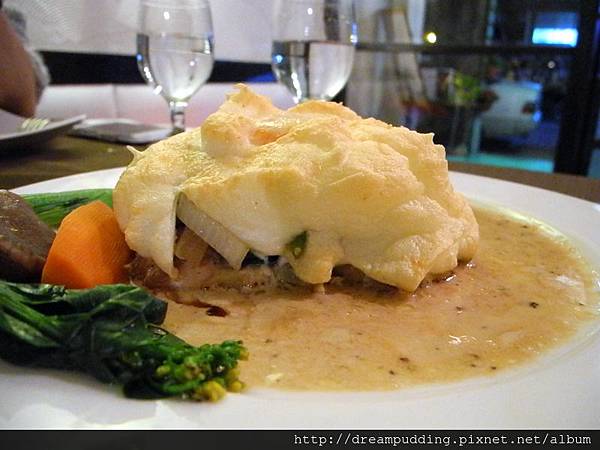這一到很特別,上面的雪山泡泡是把蛋白打發蓋住雞腿排再讓它慢慢烘烤變成輕盈的膨脹蛋白霜,最上面還有一顆蛋黃,是代表日出嗎^0^?
