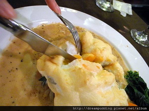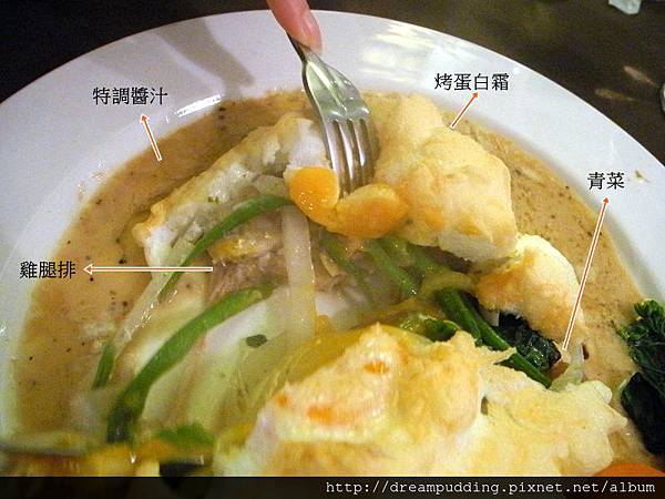 切開之後會發現這道菜真的不簡單,烤蛋白霜下面鋪著青菜、洋蔥跟鮮嫩的雞腿排,底部的醬汁是用料理肉汁的精華再經過調味而成的,所以口感很多層次,不知該如何形容,很濃郁。