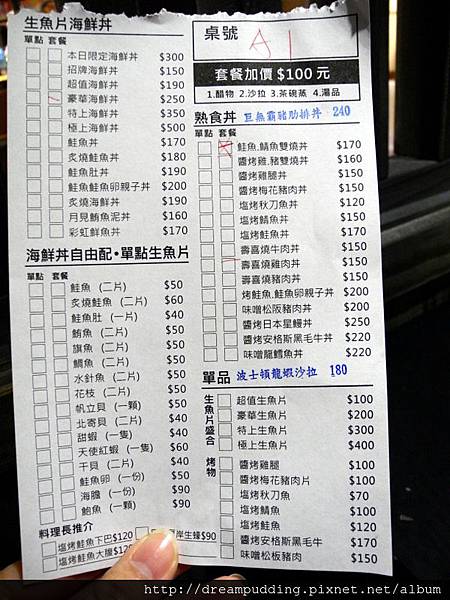 上面的價格是單點的價格,如果要加套餐,記得要畫在套餐的格子裡,結帳時服務人員會幫顧客在金額上再加上100元,而且會仔細地再跟顧客確認一次餐點。