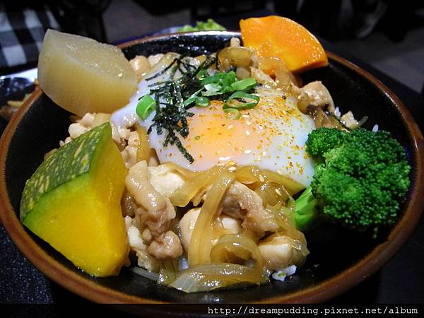 壽喜燒雞肉丼,點餐時服務生會先告知,丼飯上面會有一顆半熟溫泉蛋,會先問客人能不能接受。這丼飯比我想像中豐富,還有附上蘿蔔跟南瓜還有青花椰。