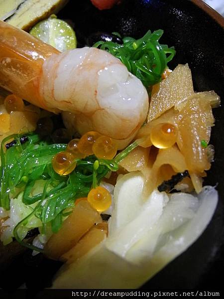 料很豐盛,生魚片幾乎都是給兩塊,厚度也夠,還有鮭魚軟、干貝、花枝跟一隻大甜蝦,配菜料像是豆皮跟嫩薑還有筍乾跟綠藻絲也都有。