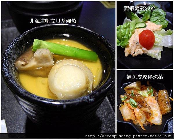 那個茶碗蒸料很多,除了有帆立貝跟小香菇還有蘆筍之外,裡面還有肉塊跟蛤蠣,口感還蠻豐富帶點鮮甜;龍蝦蘿蔓沙拉甜中帶鮮的是我的最愛;右下方的鯛魚皮涼拌泡菜有著魚皮的膠質,雖然微脆微Q,但因為膠質的關係微黏,所以我比較不喜歡,可是同行的友人覺得很不錯吃。