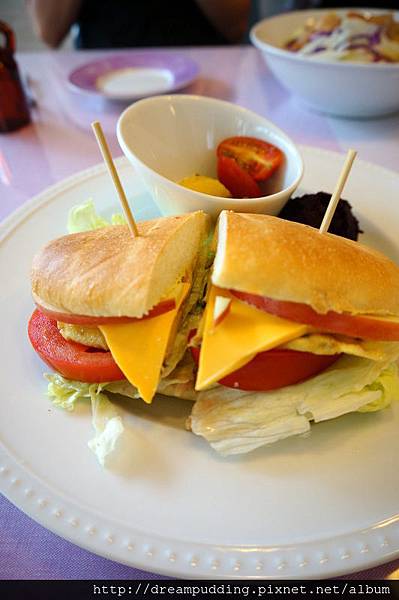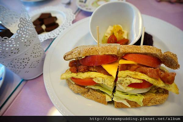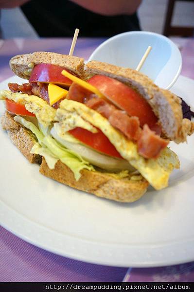 店內的麵包都是老闆娘S用心手做,吃起來樸實自然,三明治口感柔軟,內餡有新鮮生菜、軟香蛋捲皮跟切片番茄,還有濃郁的起士片,再跟里肌肉一塊咀嚼,口感豐富。