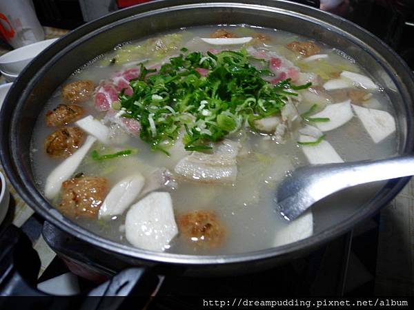 接著酸菜白肉鍋登場了,裡面的料很多,有酸菜跟小顆獅子頭、白肉、杏鮑菇、豆腐跟豬血。