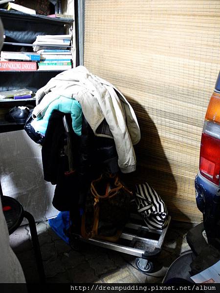 所以我們把衣服掛在推車上,真的是找地方放東西,我的包包還放在身邊的一個菜籃裡。