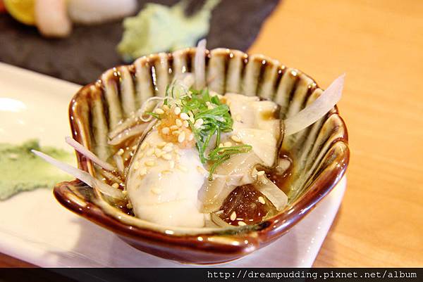 生魚片都是厚切的大塊,口感新鮮中有著冰涼感,使用的小綠應該是新鮮磨的山葵,淺淺的綠色,細微的粗曠感,口感不嗆。