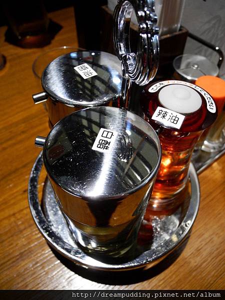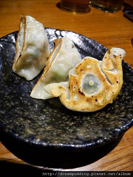 煎餃套餐有三個熱騰騰的餃子,送上煎餃時還會送上沾醬調味架。