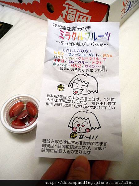 我們還去超市買了一堆東西回飯店當晚餐,這個是神秘果實,吃下他就會變成橡皮人,不是啦,是吃下他的一小時內,所有酸的東西吃起來都會變成甜的。
