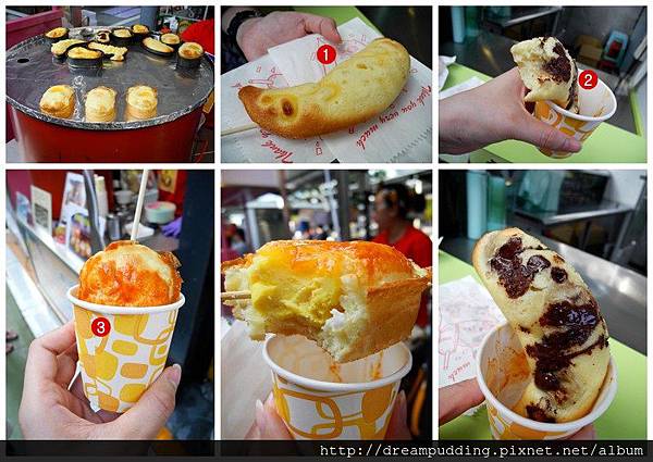 1是卡士達奶油,2是香蕉巧克力,3是招牌蛋,招牌蛋可以加辣醬,裡面有一顆熟蛋黃,我們都比較喜歡招牌蛋口味。
