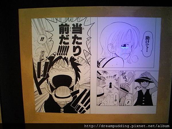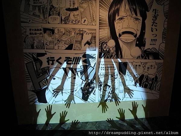還有魯夫跟每個人物成為夥伴的經典橋段,每個牆上漫畫格只要妳站到前方,就會有特殊效果,娜美這一格是她留出了眼淚。