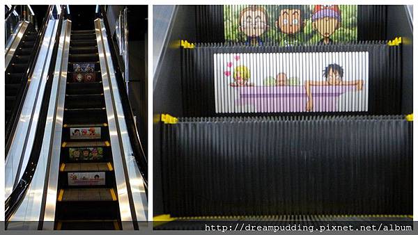 沒記錯應該是4層樓(那天太興奮了),每層樓的手扶梯都有航海王塗鴉。
