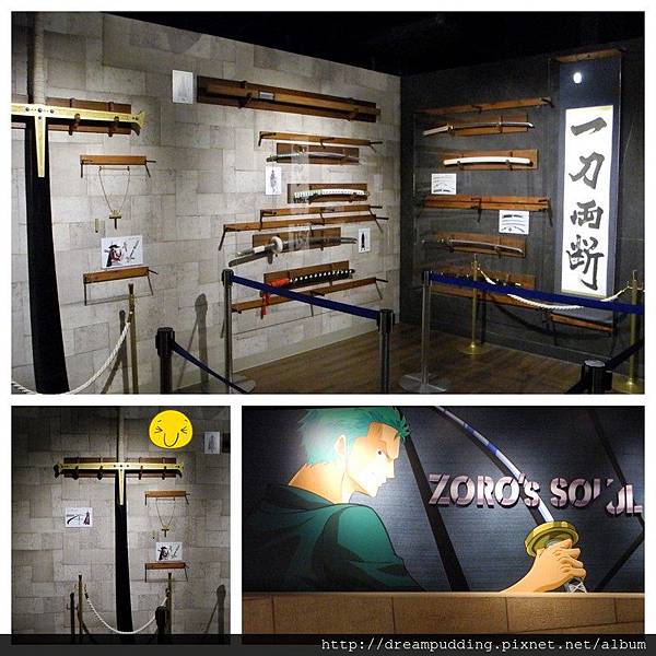 索隆的是砍砲彈,排隊入場的地方有個刀劍展示牆,也有鷹眼的刀喔!
