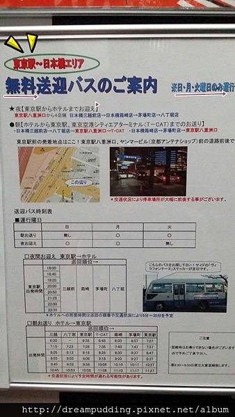 而且很貼心的一點就是,飯店還有免費專車可以載房客到東京駅,所以如果你那天剛好排的行程是在東京駅附近,又可以省下地鐵票的錢喔!不過只有星期日、一、二才有專車,有固定的時刻表,這張圖是在飯店電梯裡拍的,如果有來這邊住,想知道更詳細的,可以詢問飯店服務人員喔。