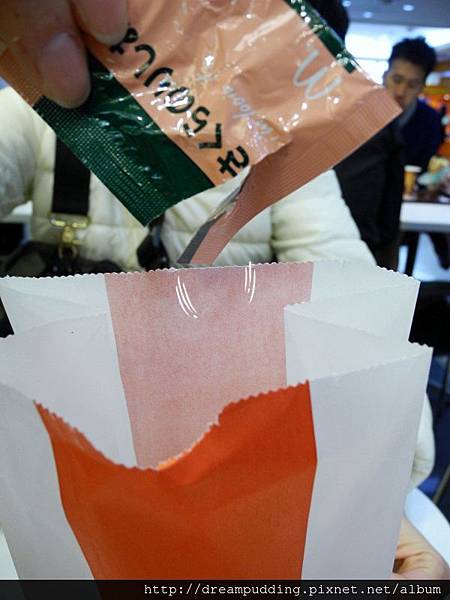 到了機場後,我們還在麥當勞吃櫻花餐,因為是櫻花季,所以有多附了一包粉紅色的調味包給我們。