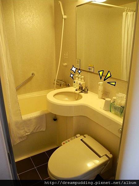 浴室一樣不大,但是有免治馬桶跟浴缸,而且沐浴乳、洗髮乳跟潤髮乳都一應俱全,還很貼心的有洗手乳,飯店有附說明說這罐洗手乳也能洗臉,而且他們也有販售。