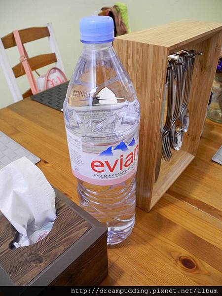 evian礦泉水是免費供應的,小餐桌沒有飲料可以點,所以可以自備飲品或是酒類,不收開瓶費喔。