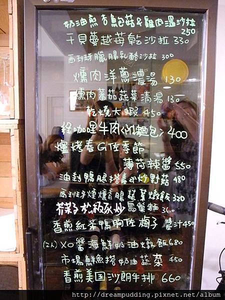 小餐桌的menu書寫在紅酒冷藏櫃裡,每天都不一樣喔!而點餐採單點制,沙拉、湯跟主餐都是單點的,甜點也是,目前尚無套餐制。