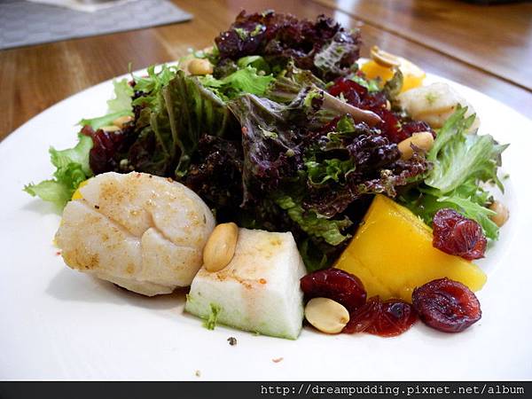 這個沙拉好吃,干貝新鮮美味,淋了白蘭地?酒氣芳香帶點刺激感,加了土豆增加顆粒感,還有蔓越莓的果乾香氣穿梭其中,我很喜歡。