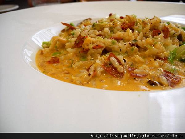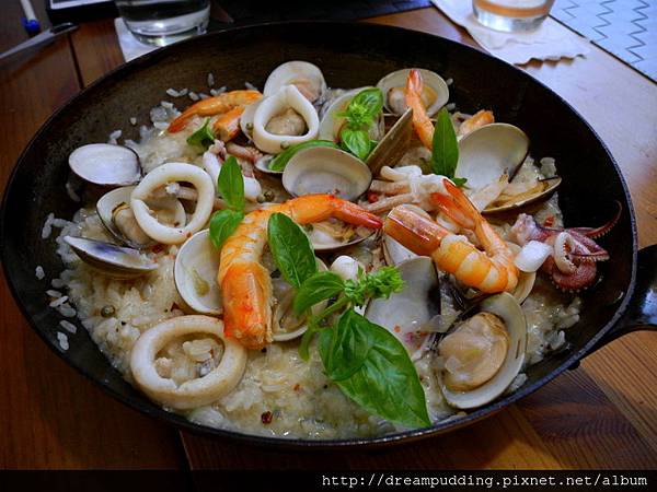 這個燉飯好吃,香氣十足而且味道濃厚,飯粒裡都有濃厚的奶油味跟鮮甜,還有九層塔的清香穿梭其中提味,雖然偏軟但口感很不錯,我們都很喜歡。