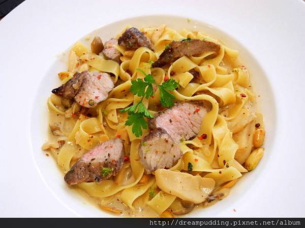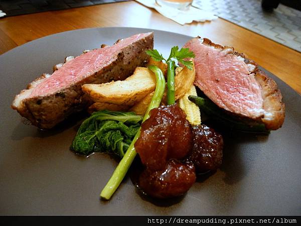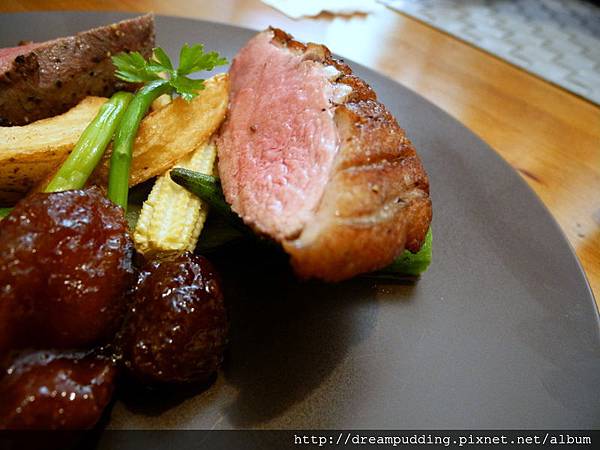這個鴨胸倒挺好吃的!皮厚但煎的略酥略Q,鴨胸肉緊緻,在咀嚼時會有些微的肉汁溢出,沒有腥味,口感嫩Q,好吃。