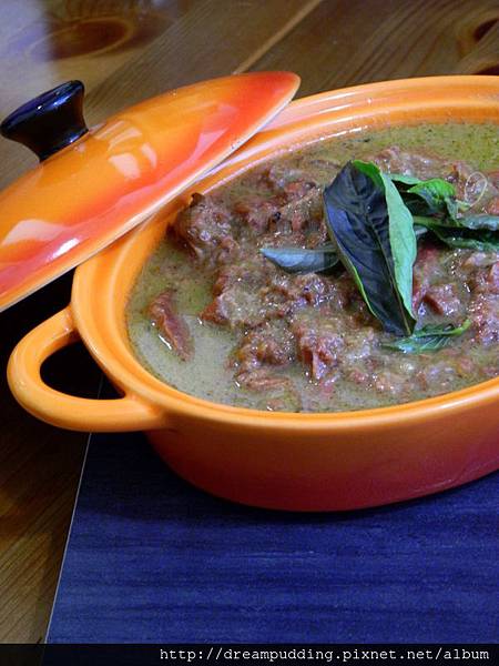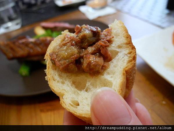 這牛肉,超軟嫩入味的,嚐不大出綠咖哩獨特的氣味,但很下飯,口味比較重,必須搭東西一塊吃,搭法國麵包很棒,因為其中的孔洞能裝盛醬汁;後來麵包吃完了想再加點,可是麵包已經販售完畢了,所以我們剩了許多咖哩,可惜了,這道挺好吃的說,下次去如果還有這道,再問老闆我能不能自己帶白飯(逃)