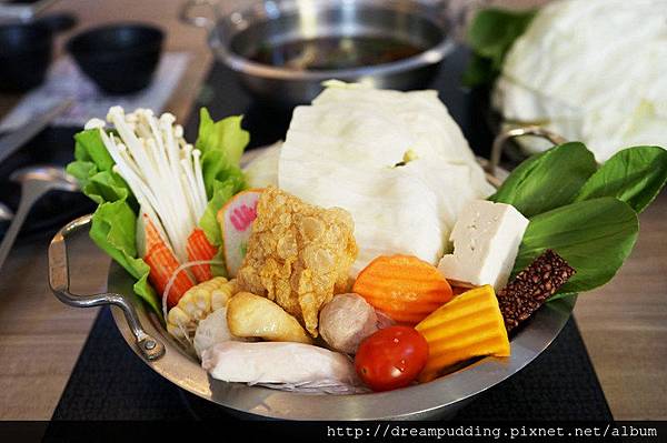 我選擇的是日式涮涮鍋,菜盤一開始就會都先幫顧客擺進去了,有我愛的豆皮跟小番茄,本來想說等等吃完能再加點,沒想到我後來被肉餵飽了,完全沒辦法再加點我最心愛的這兩樣