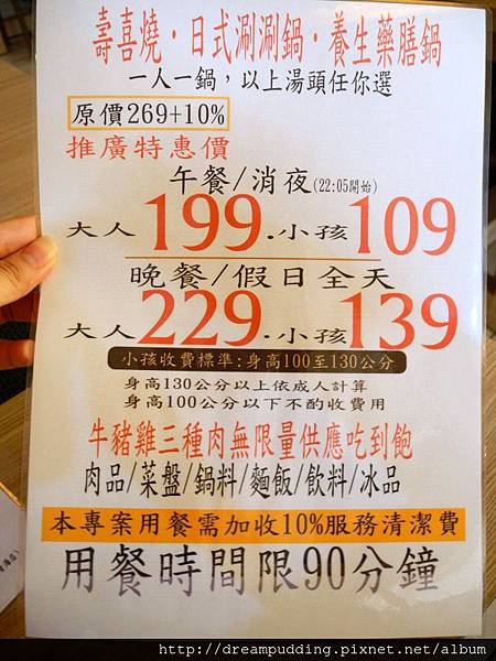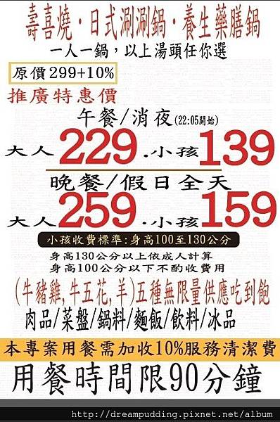 吃到飽分成兩種選擇,一種是牛、豬、雞跟牛五花還有羊肉五種肉吃到飽,菜盤、鍋料跟麵飯還有飲料及冰品也是無限供應的,午餐及消夜大人是229+10%,小孩139+10%;晚餐及假日全天則是比中午多了幾十元,還蠻佛心的,不像大部分的吃到飽都是多了將近百元。