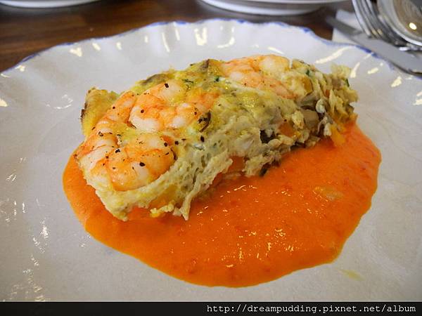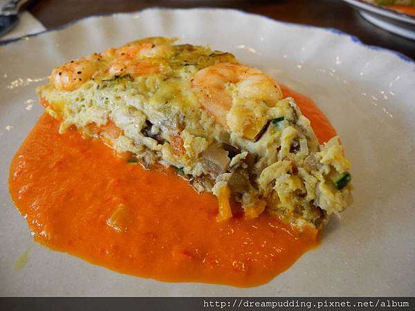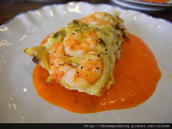 蔬菜蝦仁烘煎土雞蛋佐甜椒醬汁。