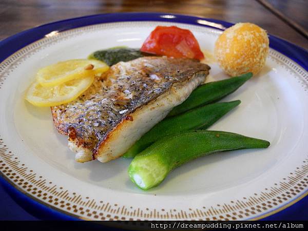 . 爐烤海鱸魚 搭配 節令時蔬 蜜漬檸檬片 與 羅勒醬