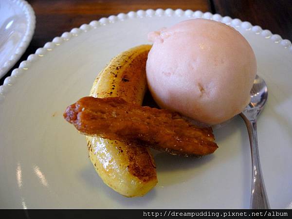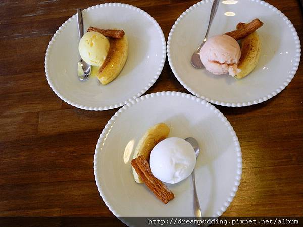 香蕉上面撒了糖下去炙烤,讓香蕉吃起來更加軟熟甜蜜,一旁的千層酥派也是薄脆的很可口,冰淇淋這天我們吃了紅心芭樂、檸檬跟香草,皓福主廚使用新鮮時令水果製作,所以他的冰淇淋吃起來清爽且有著自然的果香。