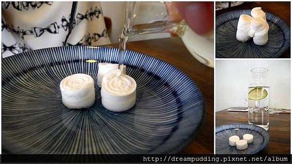 桌上的三顆壓縮小白丸是濕紙巾,將檸檬水倒入之後就是一條帶有香氣的擦手紙了,用餐前記得先將手擦拭乾淨喔^^