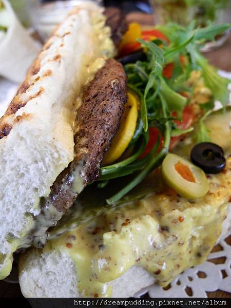 三明治外皮口感柔軟,但嚼勁還不錯,生菜很多,有著量多的蜂蜜芥末醬,讓口感甜中帶點辛香,其中還加了橄欖,所以咀嚼時會有橄欖特殊自我的味道穿梭其中,比較不會膩口。