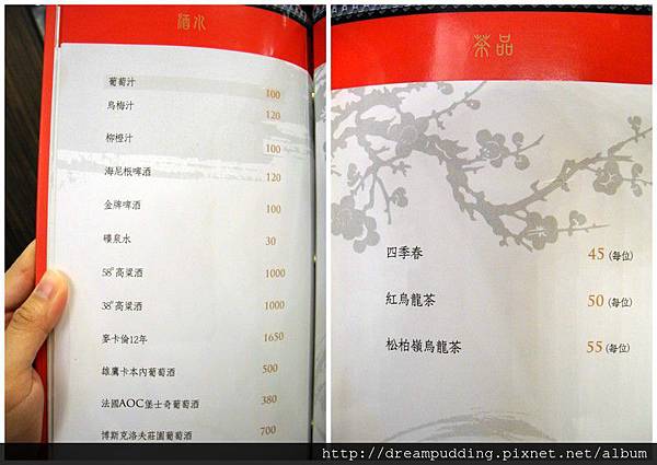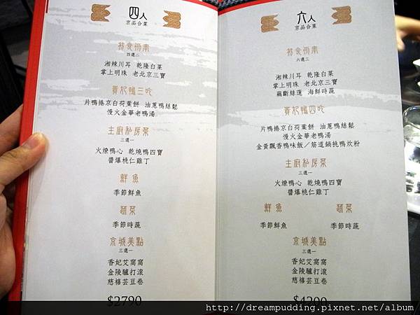 也有依人數下去選擇的,我們選擇的是NT 2790+10%的4人合菜,有兩道經典菜色、一鴨三吃、一道主廚私房菜、一道魚、一道蔬菜跟一份甜點。還另外加點了一壺烏梅汁。平均下來一個人是800元左右,而且吃不完,還外帶了許多,整體比我想像中便宜些,我以為烤鴨都要吃到超過1000元來著>。<