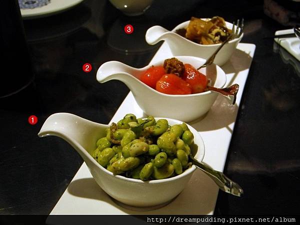 老北京三寶,第一個是青豆加豬肉末及橄欖油下去調製的開胃菜,還蠻清爽的,而且好多,這個我們就沒吃完了,因為要吃完的話,每個人要吃好幾匙青豆;中間的是桂花釀番茄,清爽中帶有一絲桂花的淡雅,好吃;最後方的是肉凍,有豐富的膠原,吃的時候沾一下底部的醬汁,微微的鹹,含在口中慢慢地就融化了。