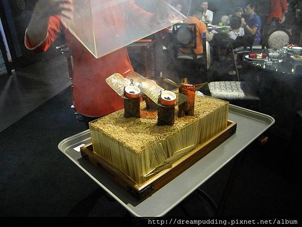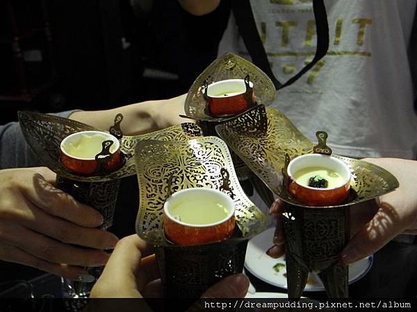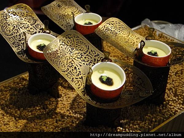 這器皿很特別,是古代為了慶祝升官而使用來敬酒祝賀的''爵'',裡面是滑嫩的蒸蛋,蒸蛋上頭有魚子醬,而蒸蛋裡有小肉塊,口感清雅卻豐富。