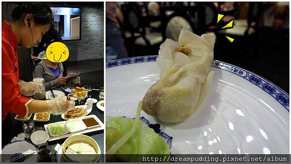 服務人員會示範,這是片鴨捲京白荷葉餅,手工餅皮略Q帶有些微嚼勁,裹著蔬菜的清脆跟鴨肉還有甜麵醬的潤甜,吃下去就是''幸福''二字阿