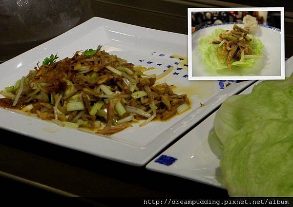 油蔥鴨絲鬆,鴨肉絲下去炒過之後,更加有風味,搭著生菜一塊變成小舟入口,十分爽口,好吃!