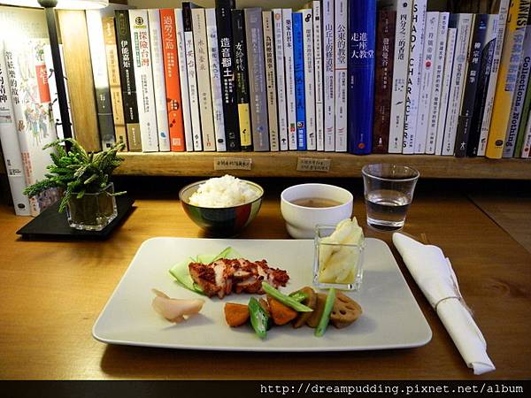 一本書店的餐點是清爽自然的,所以不會有大魚大肉,有的是用心製作的自然樸實;蓮藕蔬菜燉煮的十分入味,口感清爽且蔬菜新鮮;烤紅糟肉雖然使用三層,可是肥嫩的恰到好處,且口感不會太過鹹膩,配飯微微的恰好;苦瓜漬百香果不會太苦,果香則微微。