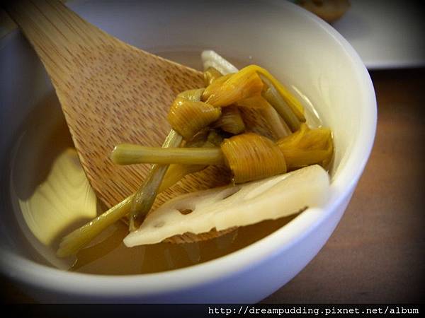 一本書店會先送上湯暖胃,這天的湯是金針湯,金針花很詩情畫意的打了個結,嚐起來清爽清甜,湯很燙,上桌時,親切的男主人會貼心提醒。