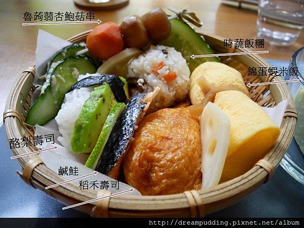 左前方的錦蛋蝦米飯用細膩的蛋皮包裹著有著細碎蝦米的飯,吃起來味道帶點鮮甜,好吃;隔壁的稻禾壽司嚐起來也不鹹膩,味道足,也好吃;再來是鹹鮭,接著是我超喜歡的酪梨壽司,第一次吃到這種搭配,沒想到酪梨跟醋飯還有哇沙米這麼搭啊!酪梨獨有的油脂跟微嗆的哇沙米還有醋飯有著奇妙的平衡,,好吃!!!右前方的蔬菜丁飯糰也是清爽路線的,也不錯。