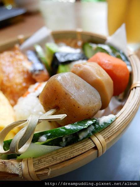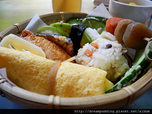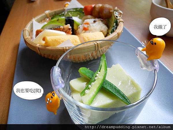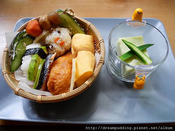 油豆腐南瓜味噌湯,湯一樣清爽甜美,小小的不知道是不是蝦夷蔥,吃起來帶點脆甜,湯可續,我喝了兩碗,結果後面的飯糰跟加點的甜點差點就給他吃不下>///<