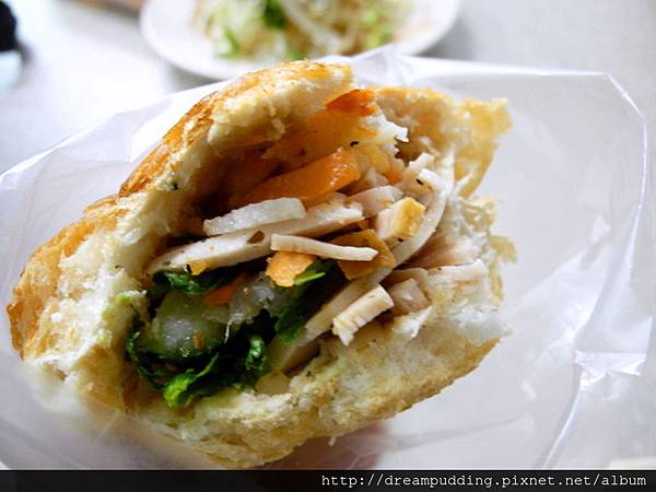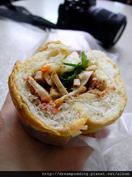 這個越南麵包好好吃!法國麵包酥中帶點細微的脆,越嚼越香,裡面的料很豐盛,抹上了肝醬之後夾著香菜、火腿、蘿蔔絲等,鹹中帶點清甜,口感很豐富且帶有層次,好吃!